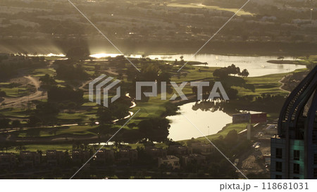 Early morning during sunrise aerial view from skyscraper with foggy weather near Dubai Marina