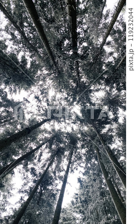 Pine trees with view from above covered with frost in winter. Morning sunset