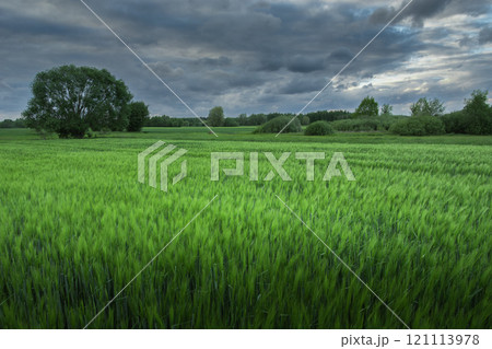 Blue sky and cloud with meadow tree. Plain landscape background for summer poster. Generate AI
