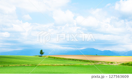 青空広がる初夏の爽やかな北海道らしい広大な畑の風景