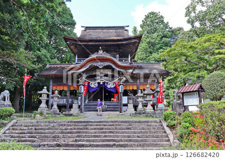 やまぐちしにある彼岸花が咲く鰐鳴八幡宮楼門形式の拝殿