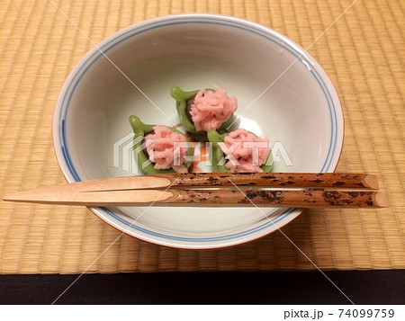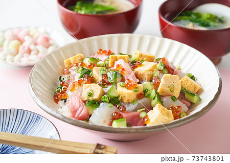 雛祭りのお料理。ひな祭りの定番ちらし寿司とはまぐりのお吸い物、菱餅と甘酒。