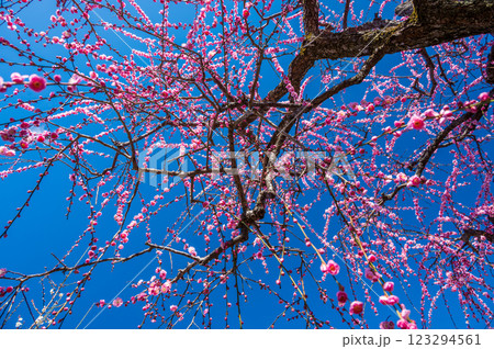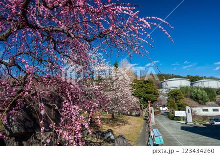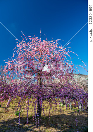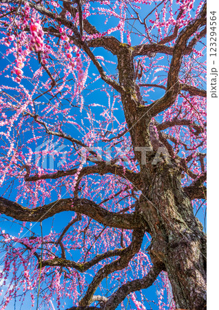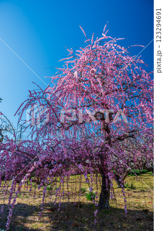 青空と枝垂れ梅 優美な梅の木 中河原梅林