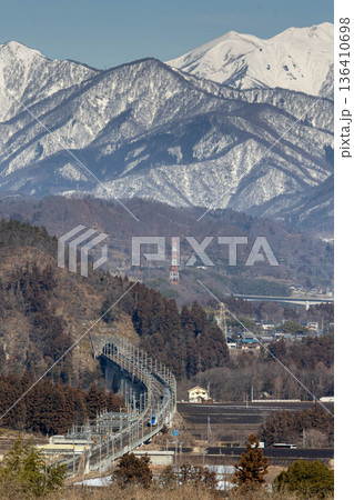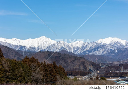 田園風景と残雪の谷川岳 上毛高原駅付近からの景色 みなかみ町