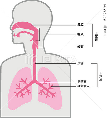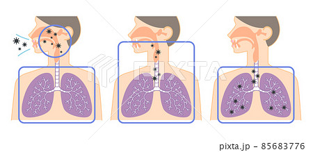 上気道と下気道へのウイルスの侵入(鼻・喉・肺の図表イラスト)