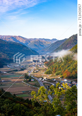 長野県上田市丸子から展望する夜明けの谷間の集落