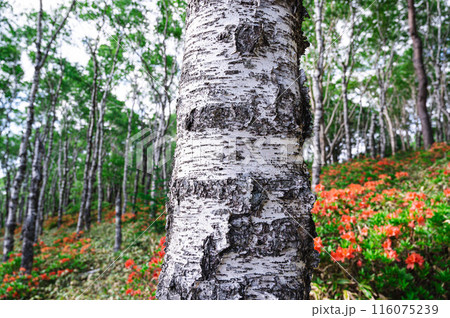 レンゲツツジ咲く神秘的な白樺林
