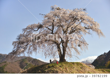 快晴の青空に満開に咲き誇る上発地のしだれ桜(地蔵桜)とお地蔵様