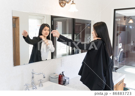 鏡の前でスーツを着て身支度するビジネスウーマン
