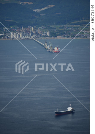 北海道北斗市上磯のセメントコンビナートと貨物船が停泊している風景を撮影