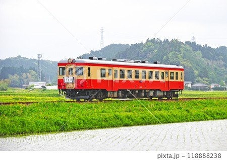 長閑な田園地帯を走るいすみ鉄道のムーミン列車