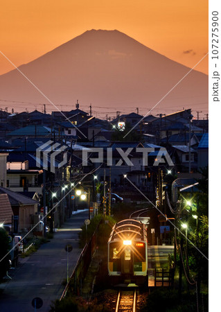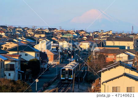 夕焼けの富士山と上総清川駅 久留里線 木更津市