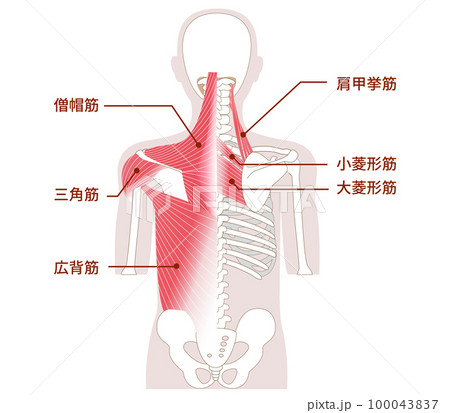 僧帽筋、首から肩、背中にかけ付着する筋肉