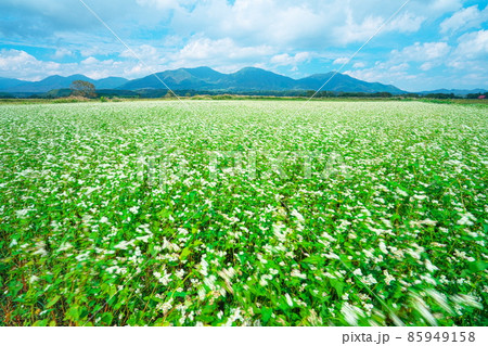 ソバ畑に咲くソバの花と蒜山三座20 岡山県真庭市