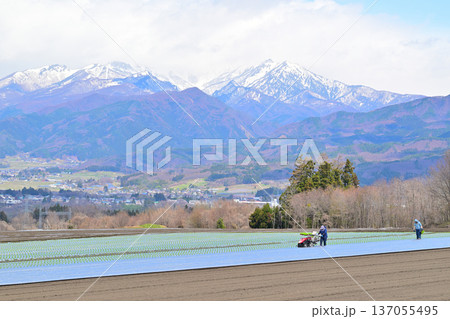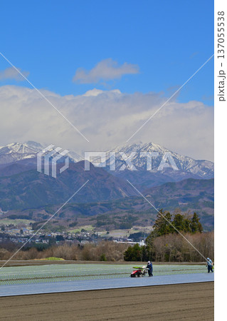 農作業中 赤城高原畑からの眺め 上越の雪山 昭和村