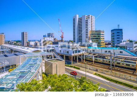 日本の藤沢都市景観 7月。東海道本線 辻堂駅や電車(オレンジと緑ラインの湘南色)などを望む=22日