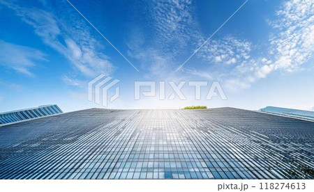 青空に伸びる近代的な高層ビルを下から見上げるアングルでリアルに描いたAI生成画像