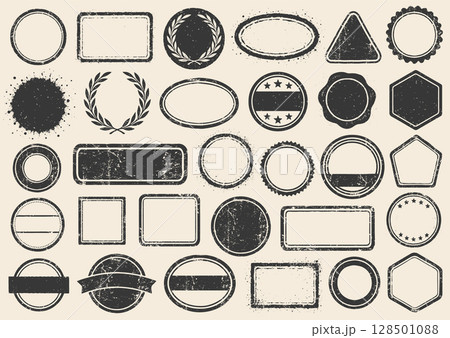 Retro Grunge Stamps frames vector icon shape set. Black round and square empty stamp border pack. Blank Stamp template grunge ink rubber labels collection. Vector image Isolated on white background.