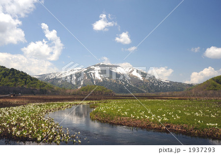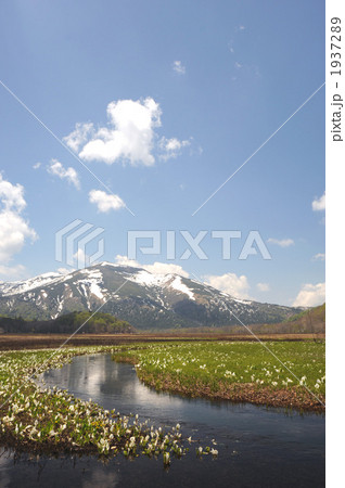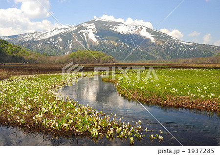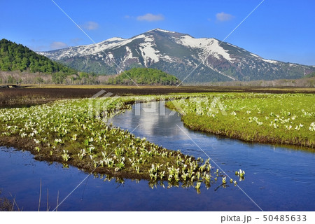 ミズバショウ咲く尾瀬ヶ原に下の大堀川と至仏山