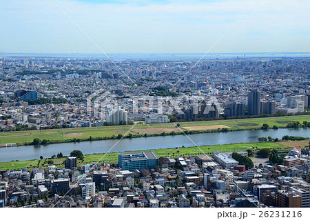 多摩川沿いの街並みと河川敷の運動場 東京都大田区