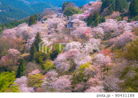 奈良県、吉野山、桜、ソメイヨシノ満開 世界遺産