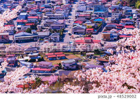 (山梨県)桜と雪・新倉山浅間公園から見る下吉田駅