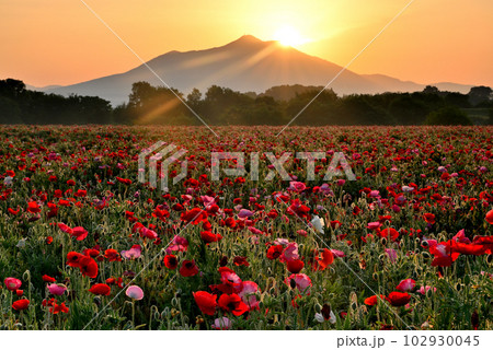 早朝の筑波山と一面に広がるポピー畑と太陽の幻想的な風景