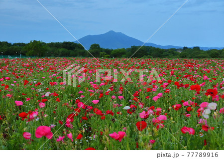 茨城県下妻市 小貝川ふれあい公園 ポピー畑越しに望む筑波山