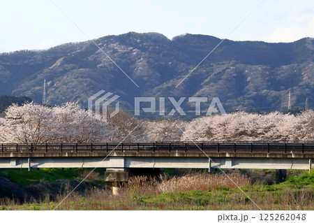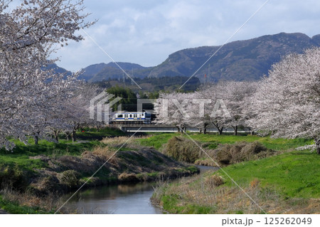 ロマンチック茨城(仏頂山に見守られ、水戸線の列車が通る涸沼川の河川敷に、咲き誇る「夢千本桜」)笠間市
