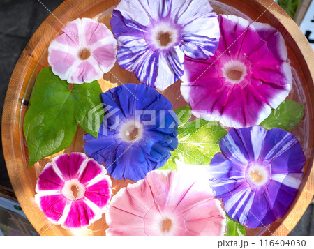 たらいの水に浮かぶ色とりどり朝顔 東京