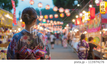 縁日の露店が並ぶ桜の並木道。あれこれの出店を見ながら思い通りの食べ歩きユカタの少女も