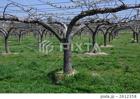 梨畑と農夫 梨の枝の剪定作業 早春の梨畑