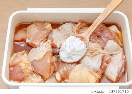 鶏の唐揚げ、味付けと粉をまぶす下ごしらえ