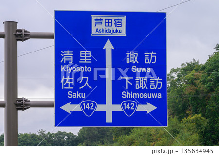 長野県の中山道ドライブコース 国道142号の道路案内看板(芦田宿・清里・諏訪・佐久)