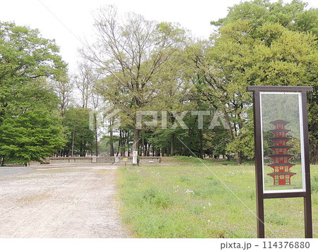 下野国分寺跡の風景と名称を刻んだ石柱/栃木県下野市