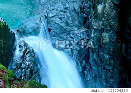 苔むした岩と周囲を流れ落ちる川の水 (山形県、蔵王中央高原、不動滝)