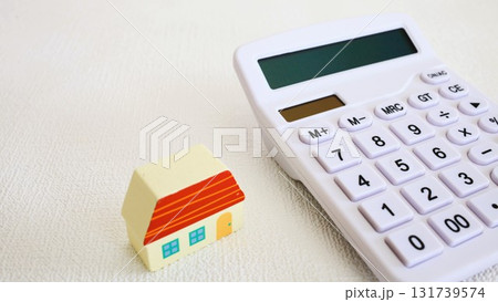 TAXと書かれたブロックと電卓、マンションの模型