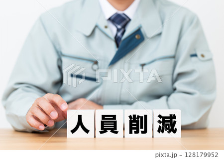 人員削減のブロックと作業着を着たミドル男性ビジネスマン