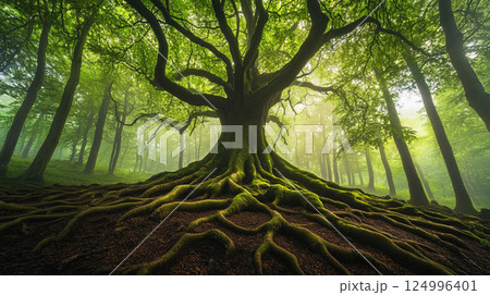Nature's intricate design showcases a stunning tree tunnel made of woven roots in a peaceful park during the afternoon