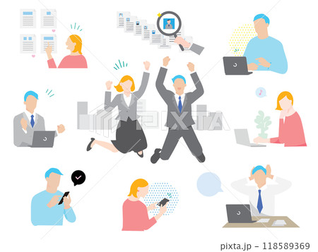就活ー成功ー就職ースマホやパソコンで仕事を探す男女ーベクターシンプルイラストセット