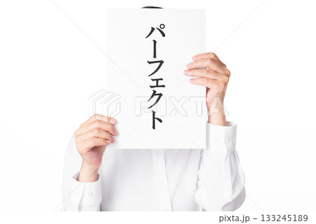 パーフェクトと書かれた紙を両手で持つ白いシャツを着た人物