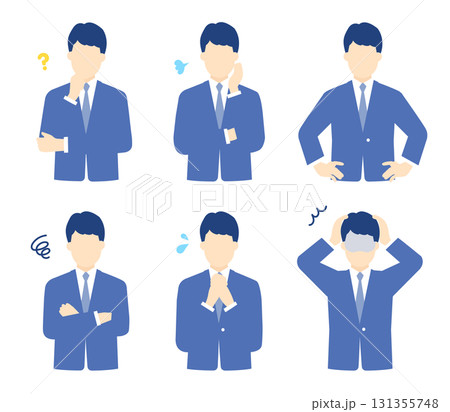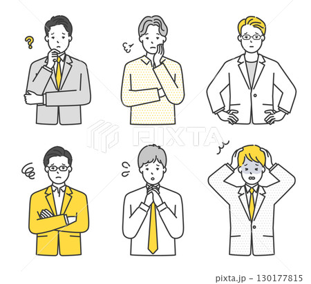 悩む男性ビジネスパーソンのシンプルイラスト素材セット