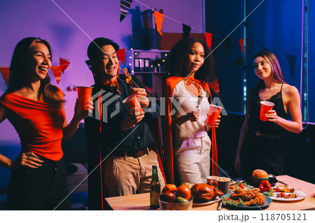 Friends, boys and girls in various Halloween costumes gathering together at nightclub for celebration, clinking glasses with drinks and showing cheerful mood
