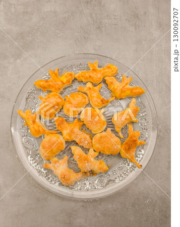 Halloween cookies shaped like bats, pumpkins, and ghosts resting on glass plate, copy space