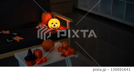 Halloween decor. A cozy setting with pumpkins and a glowing lantern.
