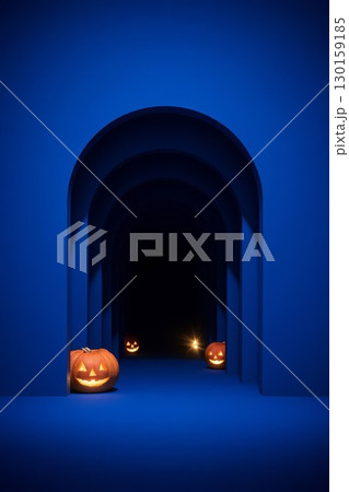 Glowing Halloween pumpkins in dark blue tunnel with spooky atmosphere. Halloween concept, perfect for seasonal promotions
