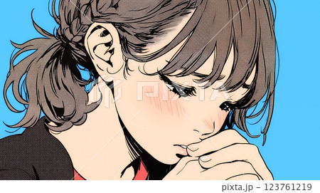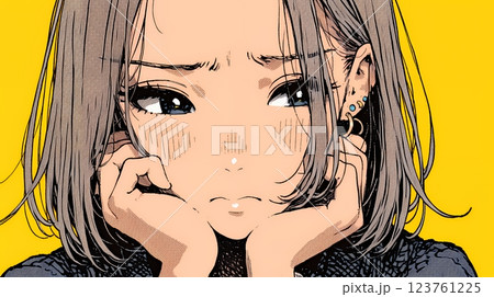 A young woman with a thoughtful expression sitting against a plain wall while contemplating her next decision