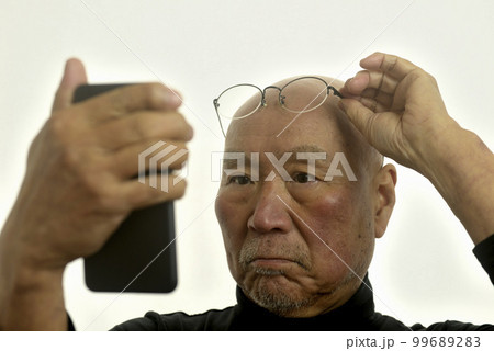 老眼のシニアがスマートフォンを見てます