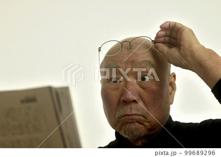 老眼のシニア男性が雑誌を読んでいる