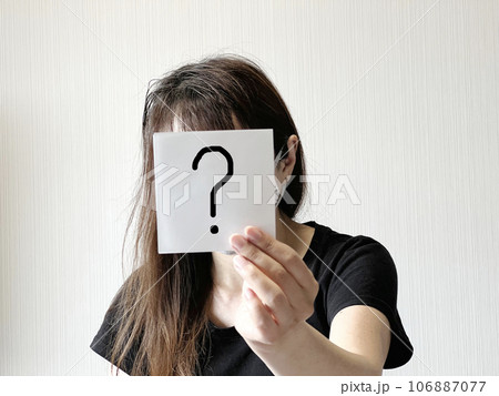 顔の前で?の紙を片手で持つ女性
